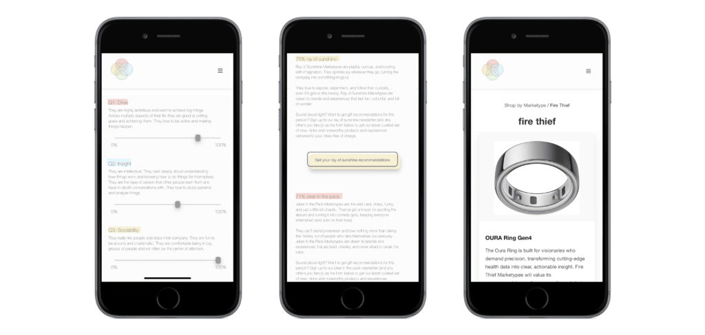 Marketypes fixes this; our fun and user-friendly eight-question quiz identifies the personality of the loved one you’re buying for, before matching them to products that align with how they think, feel and choose.